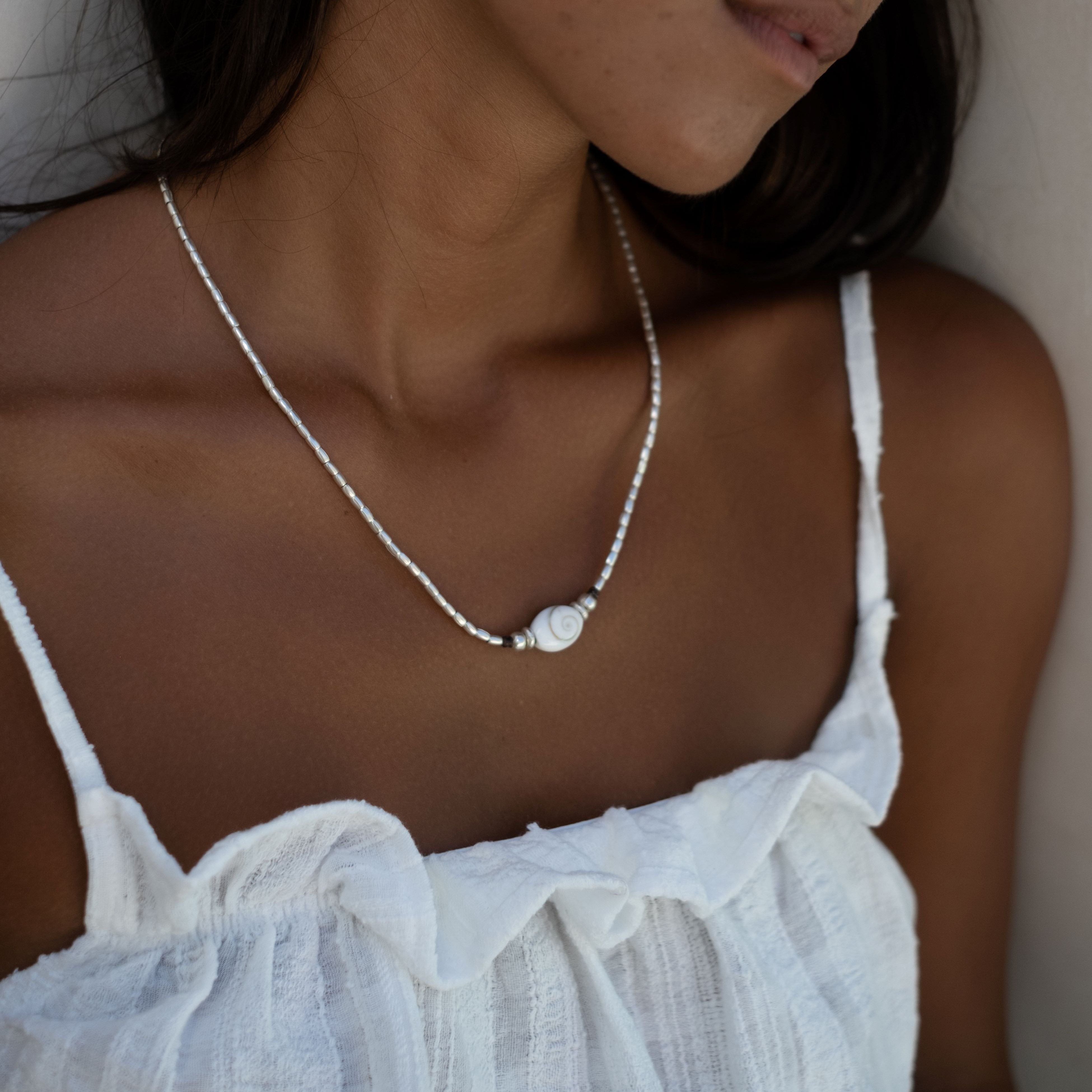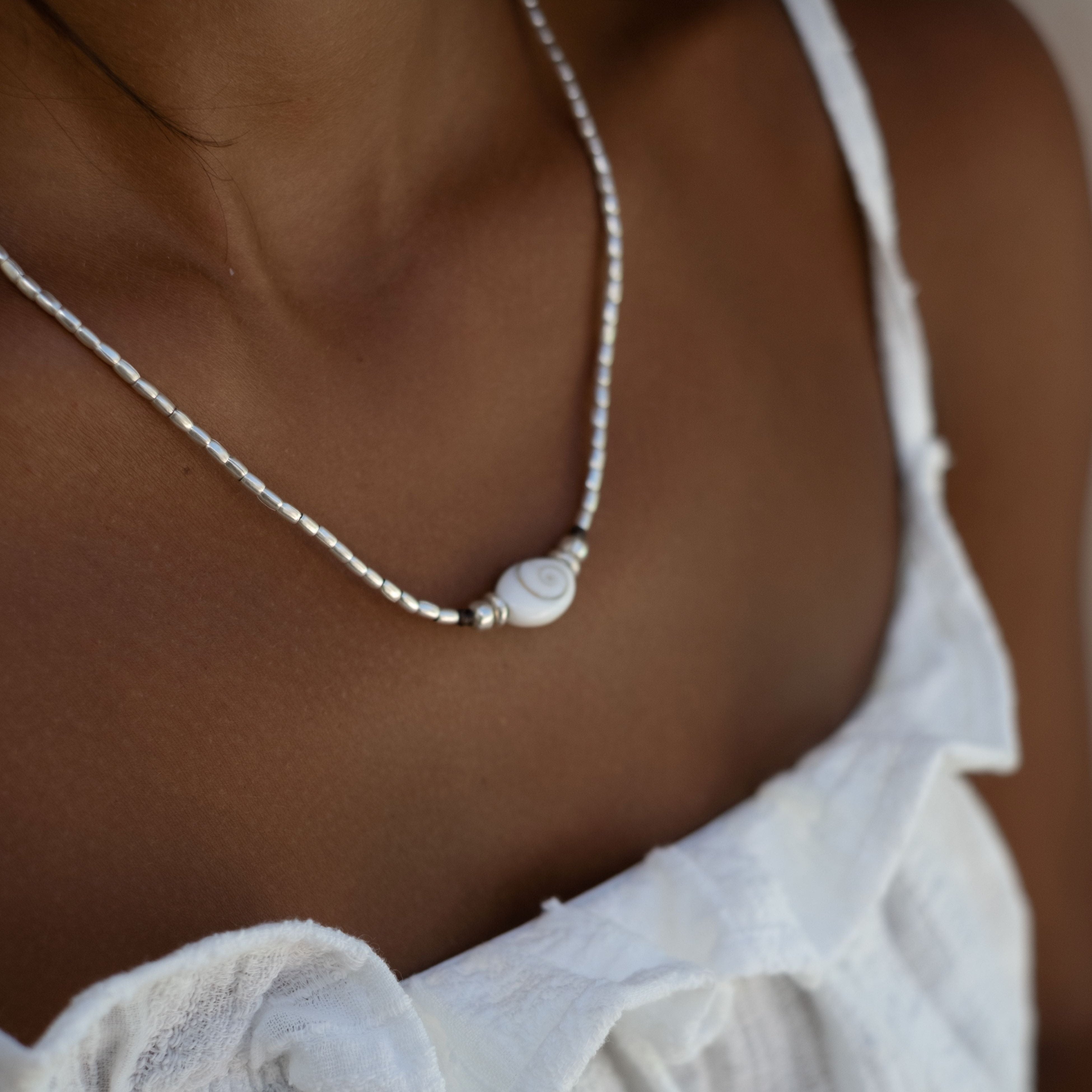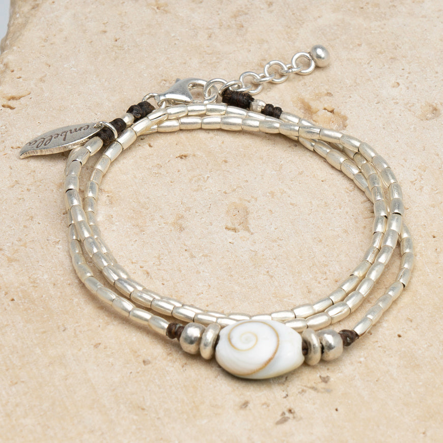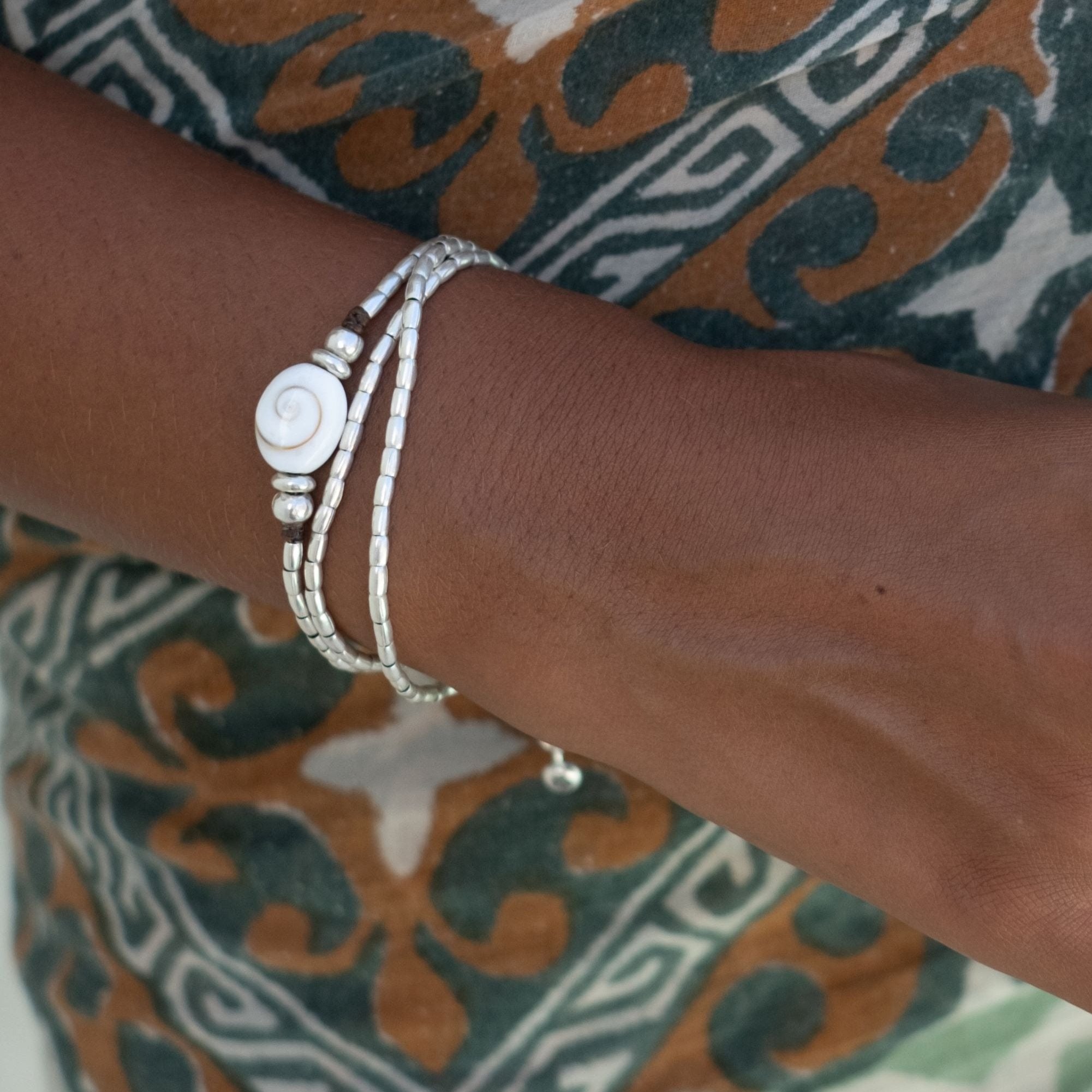 The Shiva Shoreline Wrap offers the ultimate versatility with a coastal-inspired design that can be worn as a necklace, anklet, or bracelet, depending on how you wrap it. Made with Hill Tribe silver beads, delicate Shiva Shell, and durable polywax cotton thread, this piece is both ocean-safe and chic. The sterling silver parrot clasp ensures a secure fit for any style, while its tropical charm and relaxed beach vibe make it the perfect accessory for your summer days. Wrap yourself in the beauty of the shoreline with this effortless, multi-functional piece that’s ready for any occasion.
