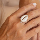 The 'Ocean Melody Ring' feature a half-cut cowrie shell set in a simple Sterling Silver design with a hammered ring band & six ocean bubbles.