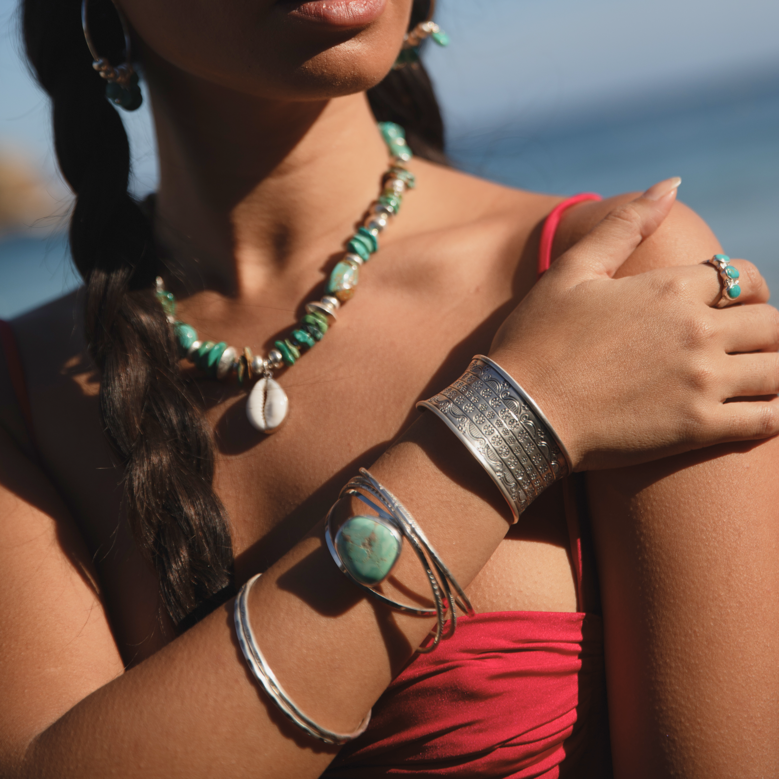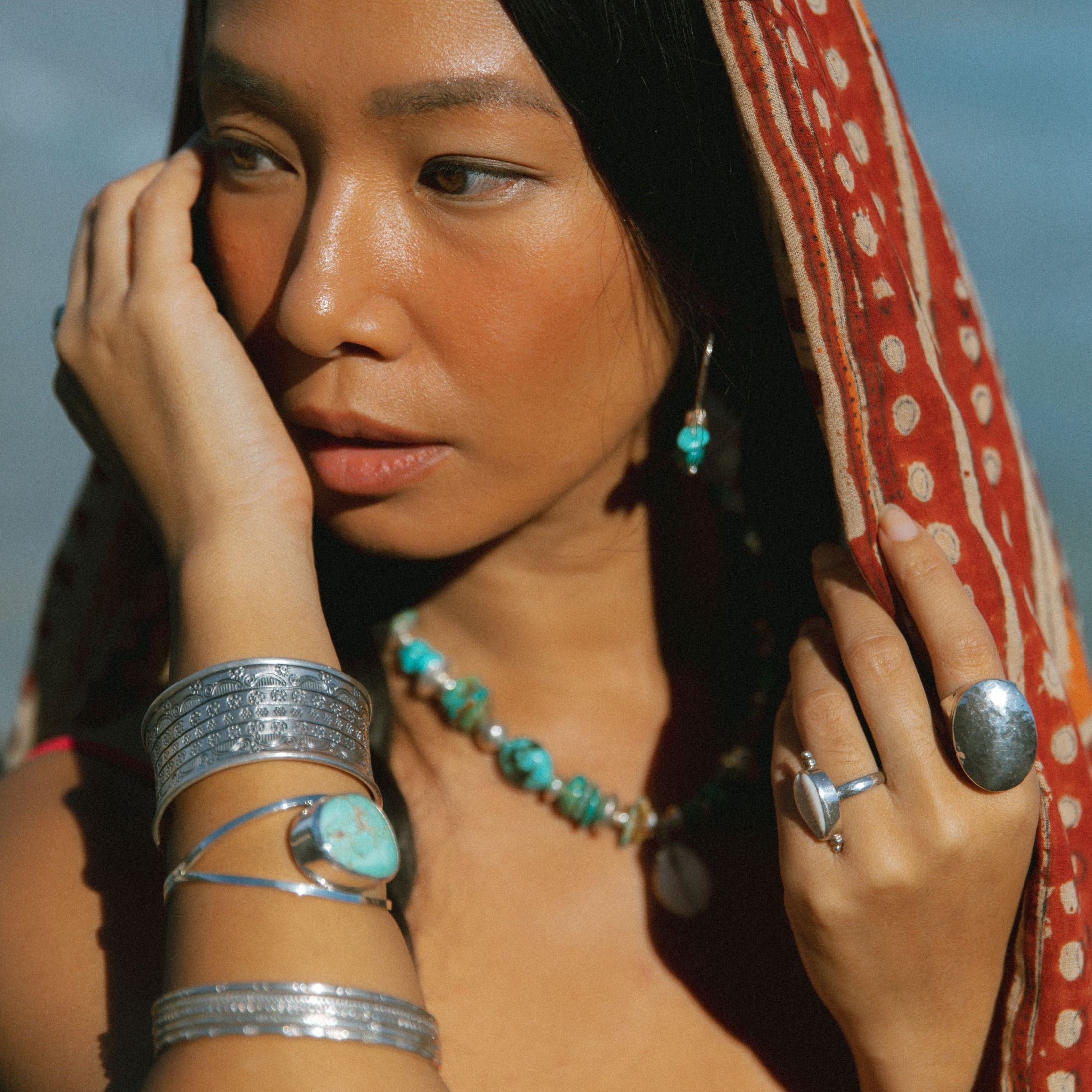 Bold, earthy, and effortlessly striking — the Turquoise Cypress Cuff is a statement piece for the modern adventurer. Featuring a natural turquoise chunk set in sterling silver atop a double-band silver cuff, each stone is unique, celebrating the beauty of natural materials. Perfect for layering or wearing solo, this cuff brings texture, colour, and individuality to any look — a piece that feels both grounded and elevated.