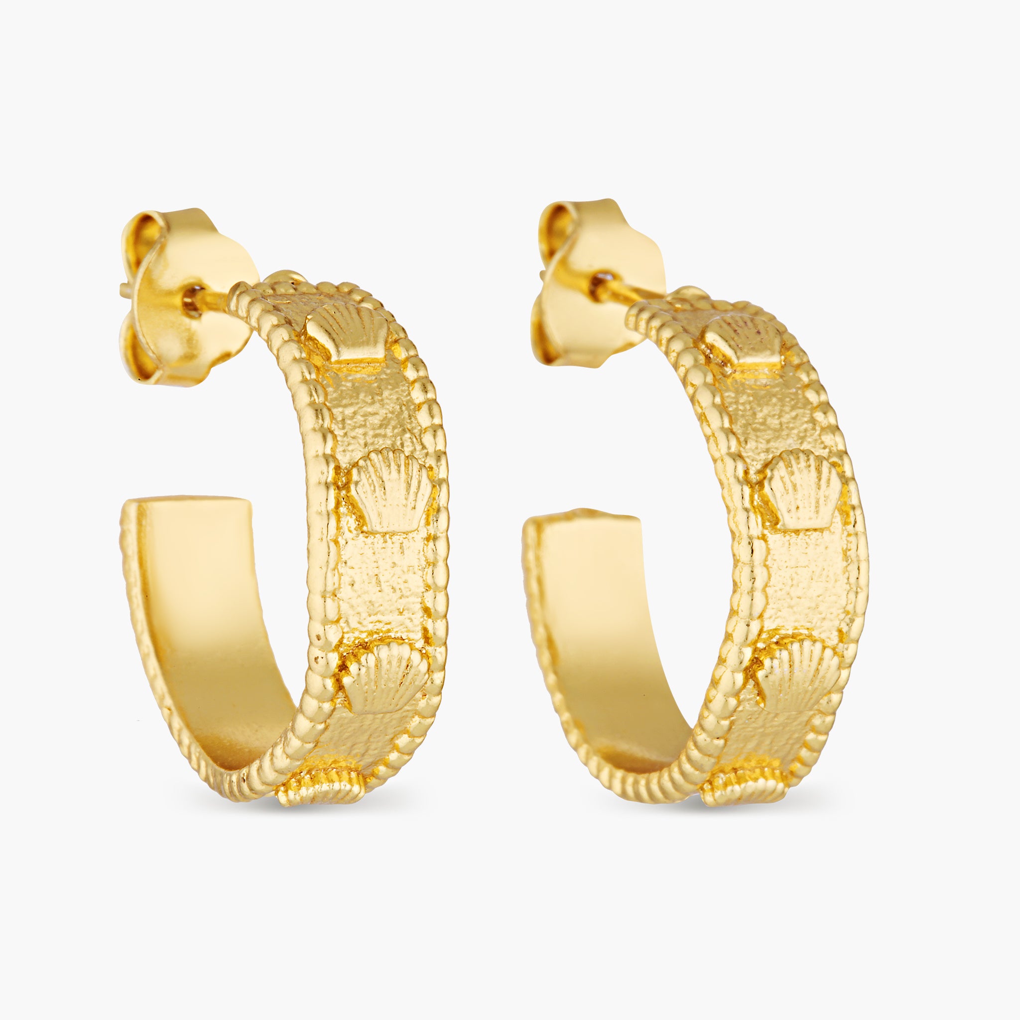 Ancient craft with a golden glow. Our Golden Shoreline Hoops are crafted from gold vermeil and detailed with delicate shell charms — a playful nod to the sea. Lightweight and versatile, they’re designed to move effortlessly with you, from sunlit shores to evening soirees. Pair them with the matching Golden Shoreline Bangle for a look that feels both timeless and radiant.