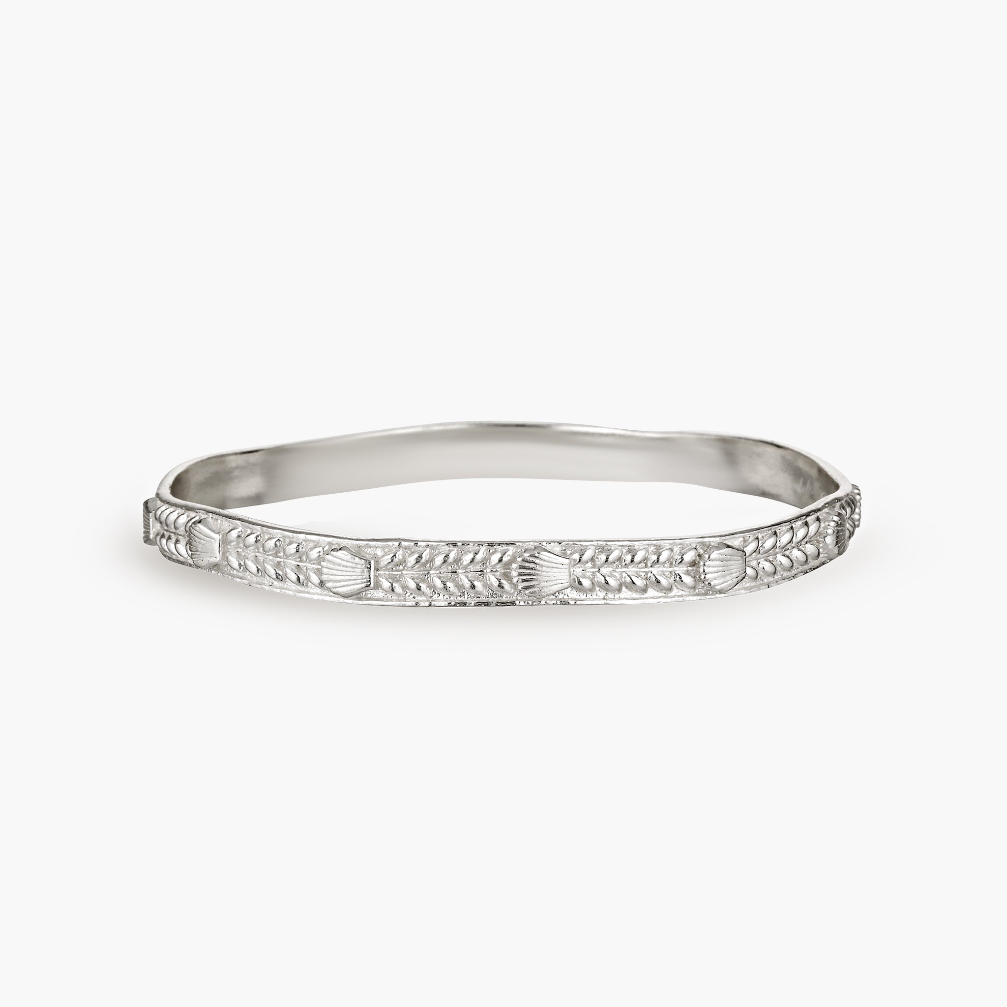 Crafted in sterling silver with intricate shell-inspired details, the Silver Shoreline Bangle brings ancient artistry into the everyday. Wear it stacked high or solo for an effortless touch of ocean-inspired beauty. Designed to pair perfectly with the matching Silver Shoreline Hoops.
