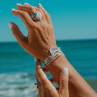 Immerse yourself in the beauty of the Crystal Tide Wrap. Crafted with faceted aquamarine, sea bubble charms, and a new moon charm, this adjustable wrap captures the serene essence of the ocean. Handcrafted with Hilltribe pure silver, it offers a perfect fit. Experience the tranquillity and elegance of the Crystal Tide Wrap, a stunning embodiment of the sea's allure.