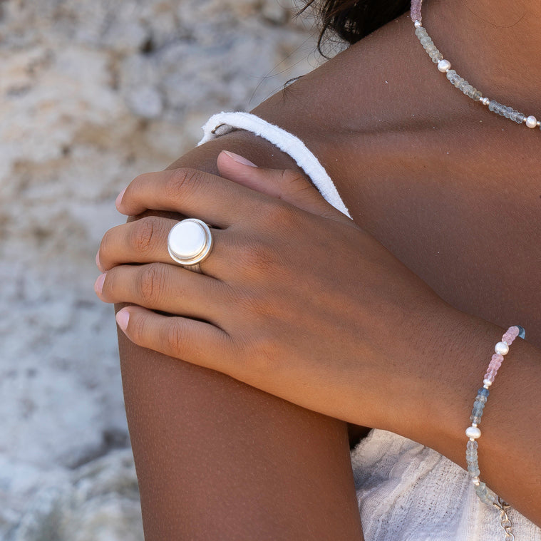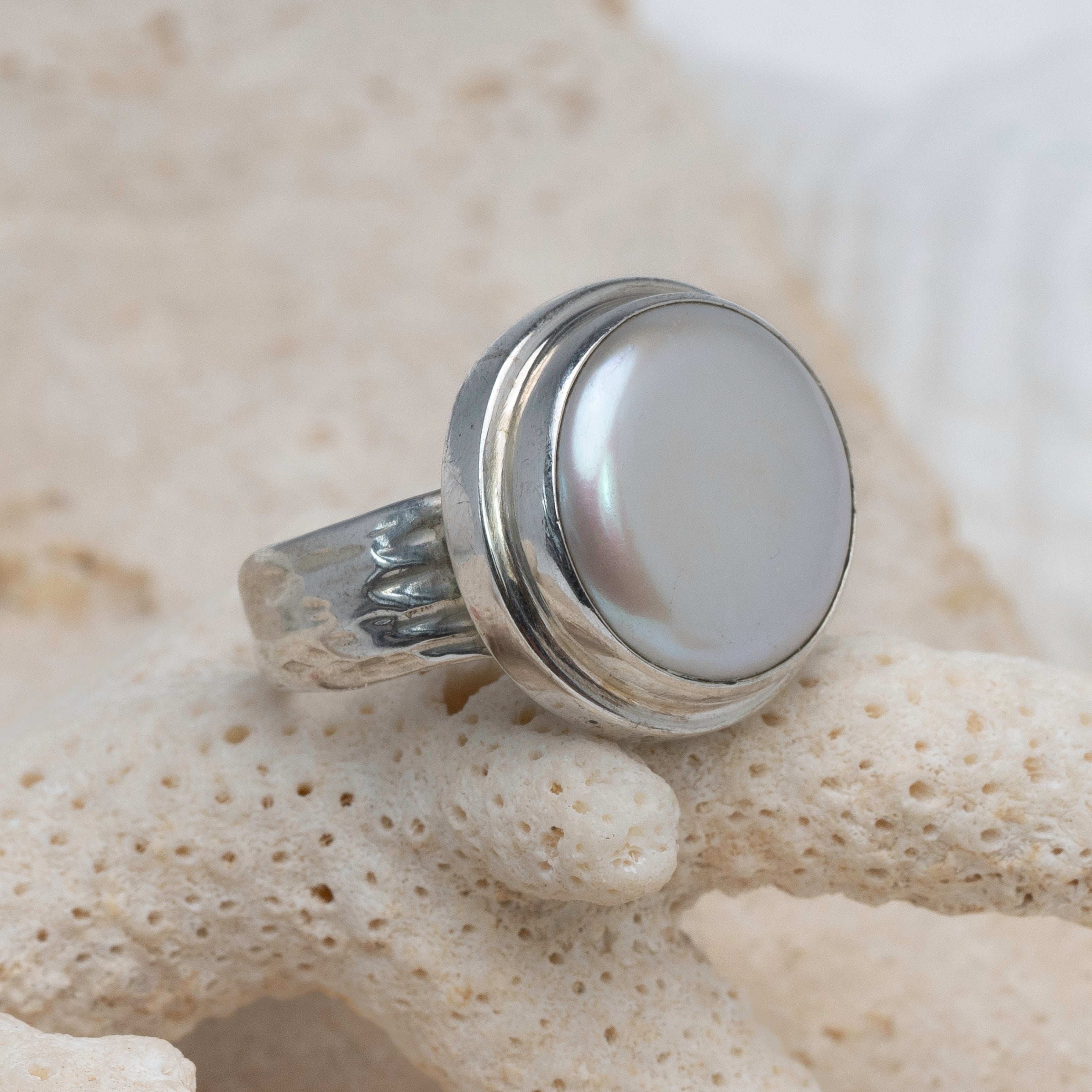 Introducing our Deep Sea Pearl Ring, a beautiful piece that exudes timeless elegance and artisanal craftsmanship. This stunning ring features a lustrous round pearl, beautifully set in sterling silver. The band is hand-hammered, adding a unique texture and character to each piece. Don't miss out on this exclusive and exquisite accessory.
