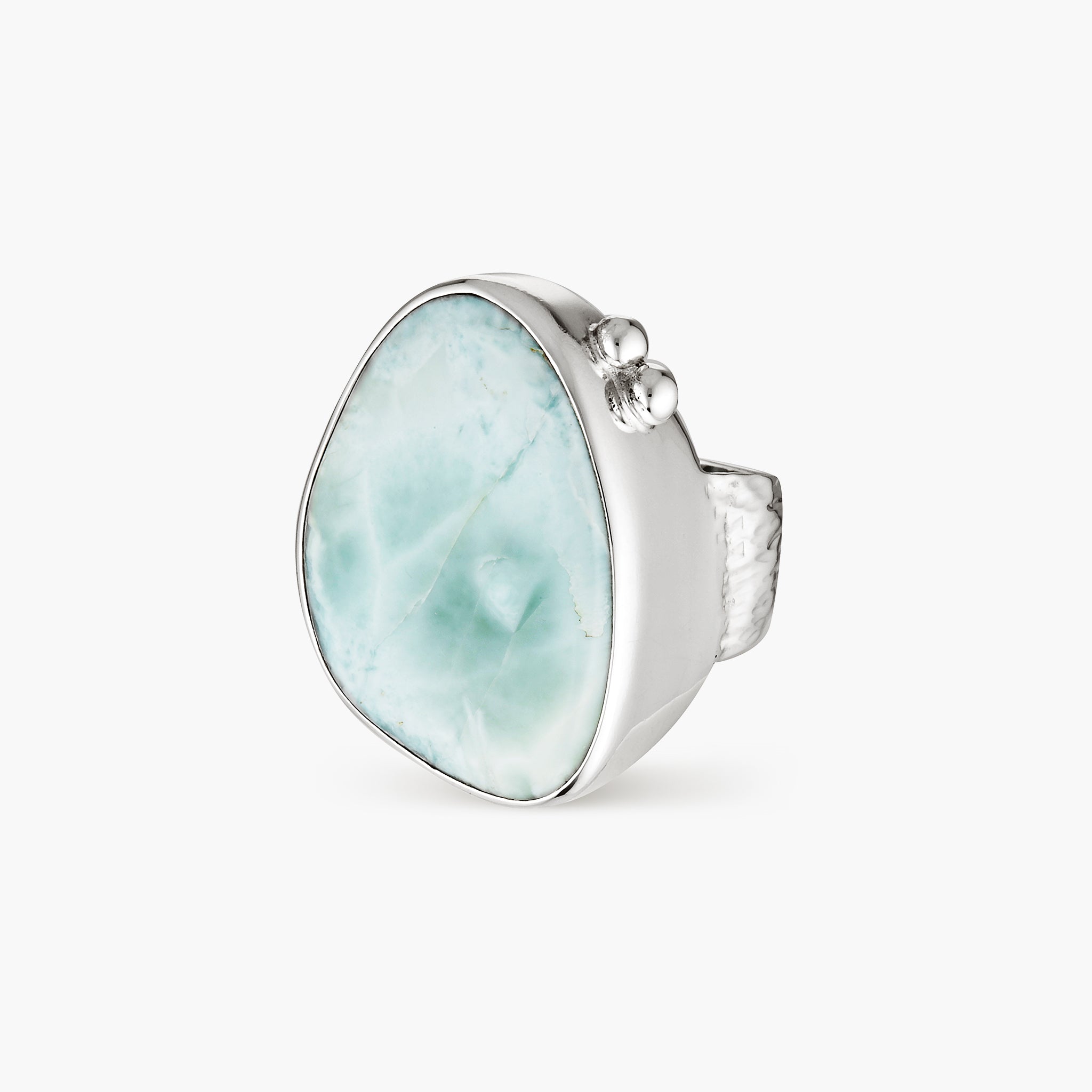 Discover the enchanting beauty and healing benefits of Larimar with our Larimar Sunkissed Ring - Large. Crafted from sterling silver, this ring features a mesmerizing Larimar stone known for its calming and soothing properties. Let the serene energy of Larimar accompany you throughout your day - wear this ring to promote relaxation, reduce stress, and enhance your communication skills.