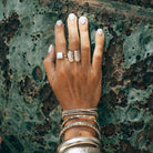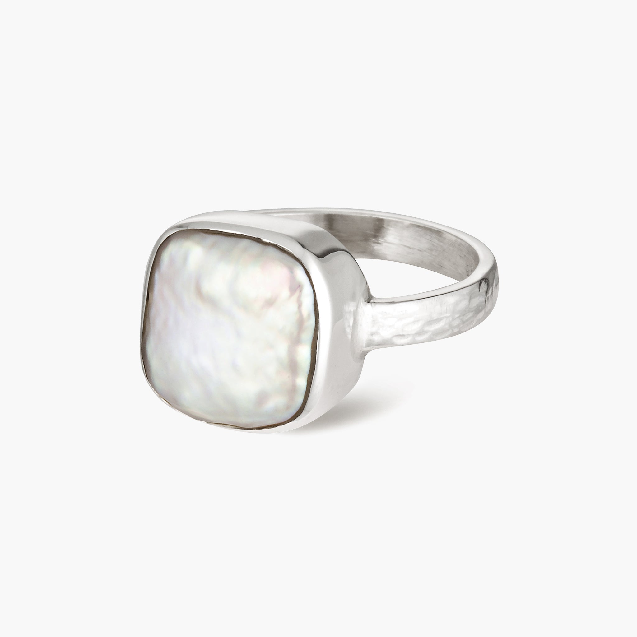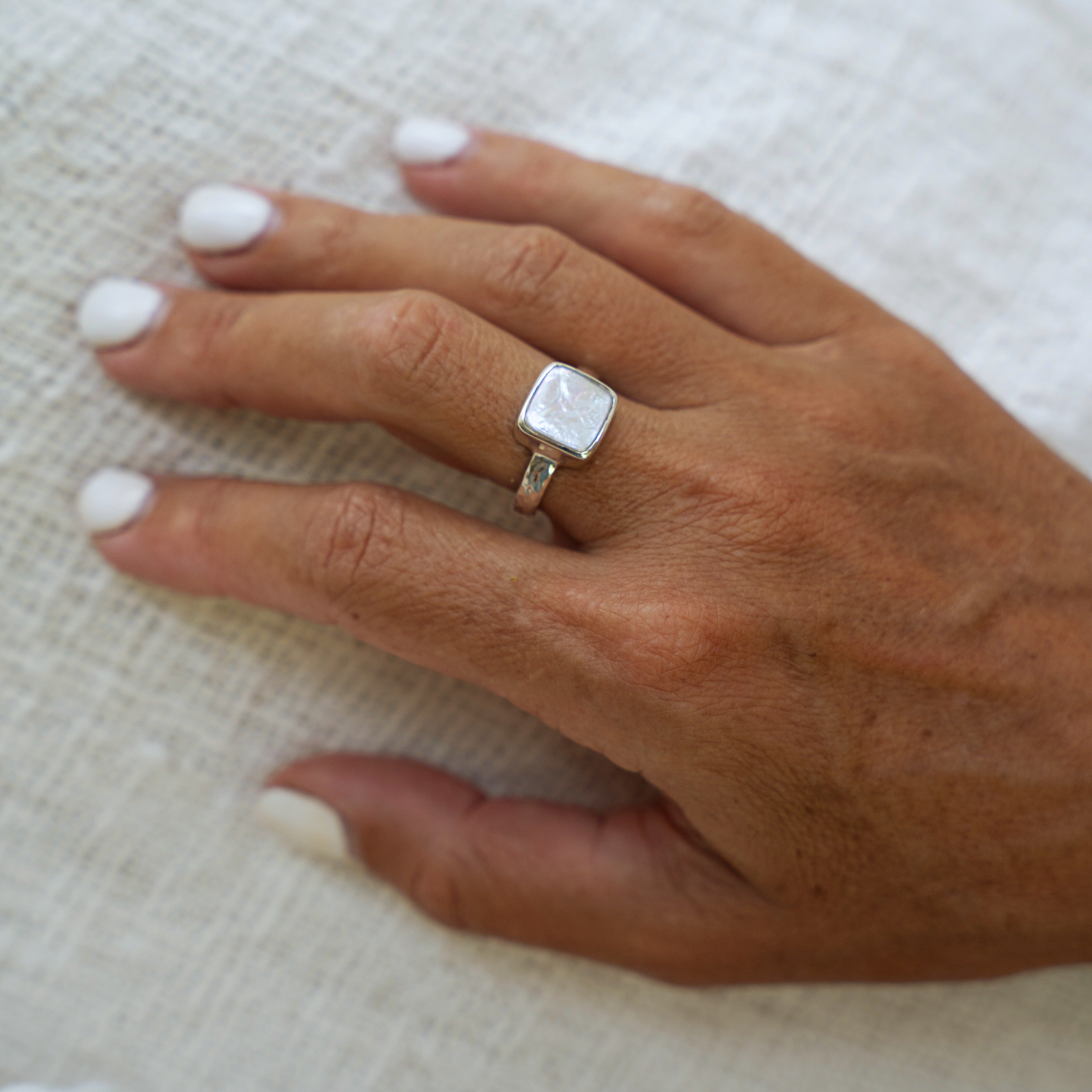 Introducing our mother of Pearl Ripple Ring, a captivating reflection of the serene ocean's beauty. This exquisite ring features a mother of Pearl gem, delicately set in sterling silver. The band of the ring is adorned with a mesmerizing ocean ripple effect, reminiscent of the tranquil waves. Mother of Pearl, also known as the "stone of sincerity," carries a deep spiritual meaning. It is believed to bring forth the gentle energies of the sea, promoting inner peace, emotional balance, and harmony in one's life.