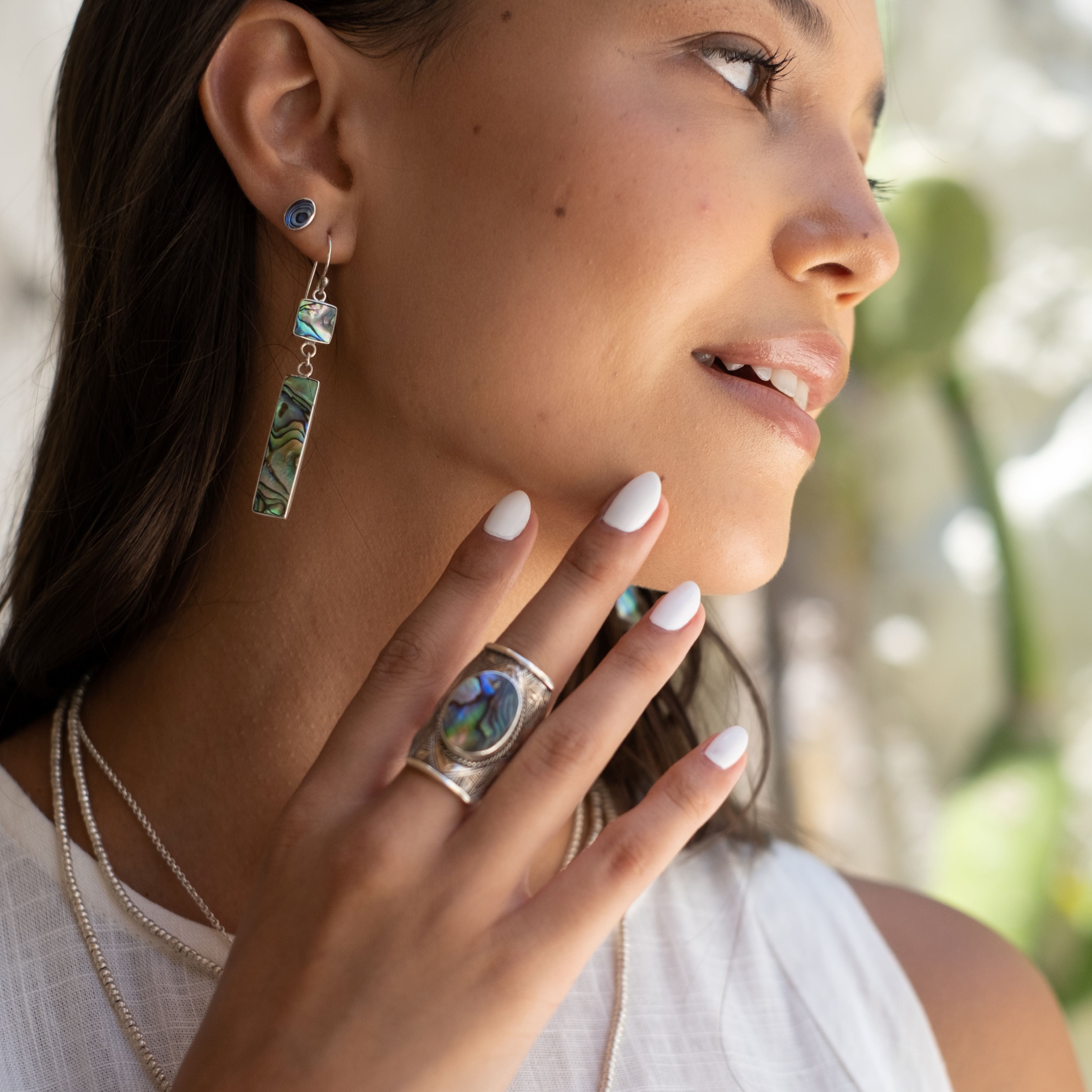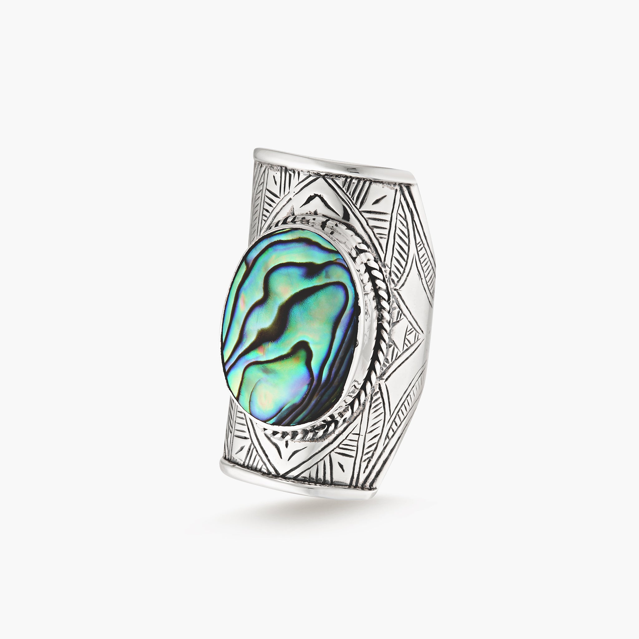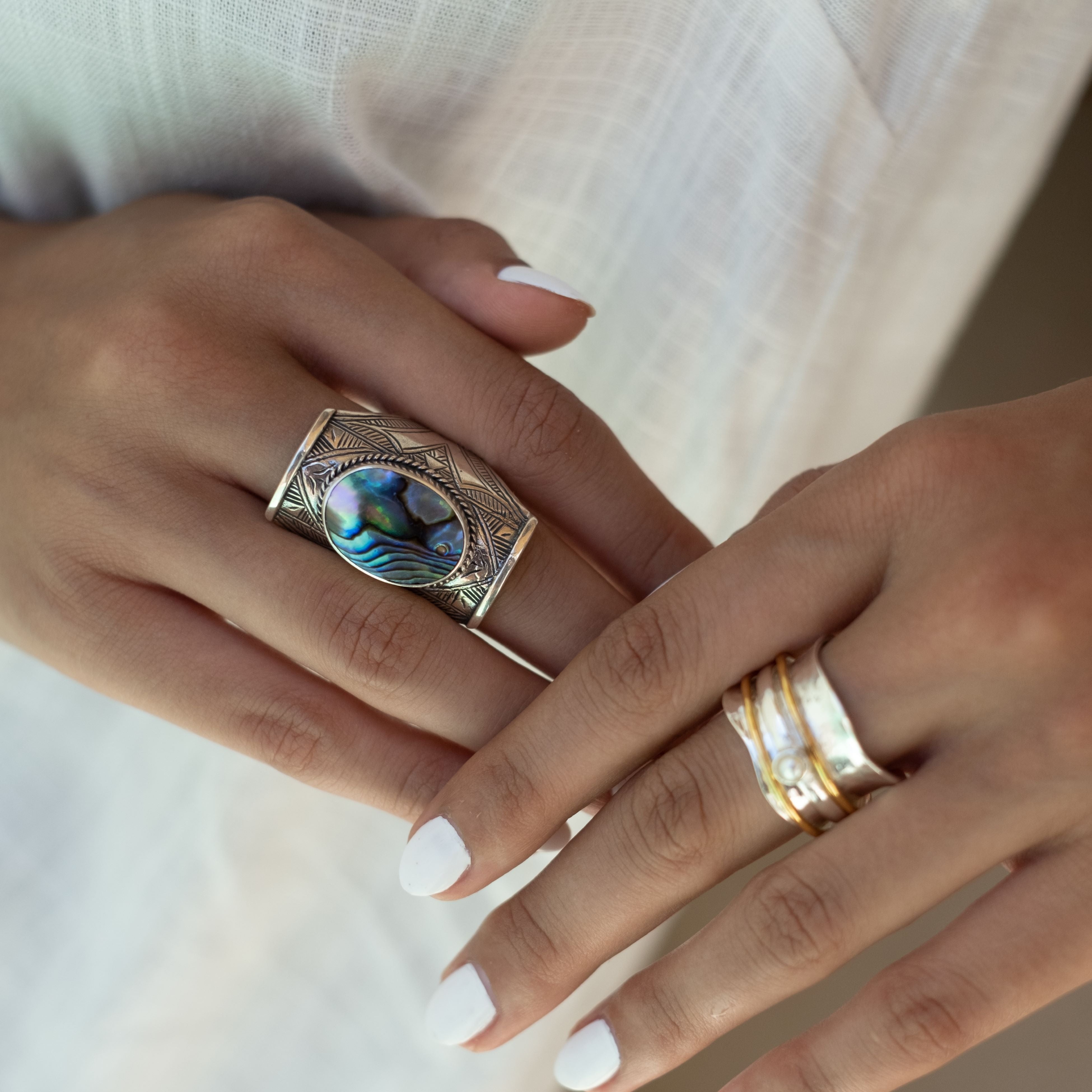 Embrace the artistry of the coast with the Paua Seaside Ring, a Moroccan-inspired design crafted from sterling silver. Featuring a mesmerising Paua shell centrepiece, its iridescent blues and greens capture the essence of the ocean, while the intricate hand-engraved details lend a touch of global elegance. A statement piece that blends coastal charm with timeless craftsmanship, this ring celebrates Paua's natural beauty and its calming, balancing energy.