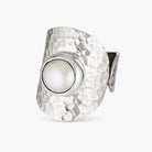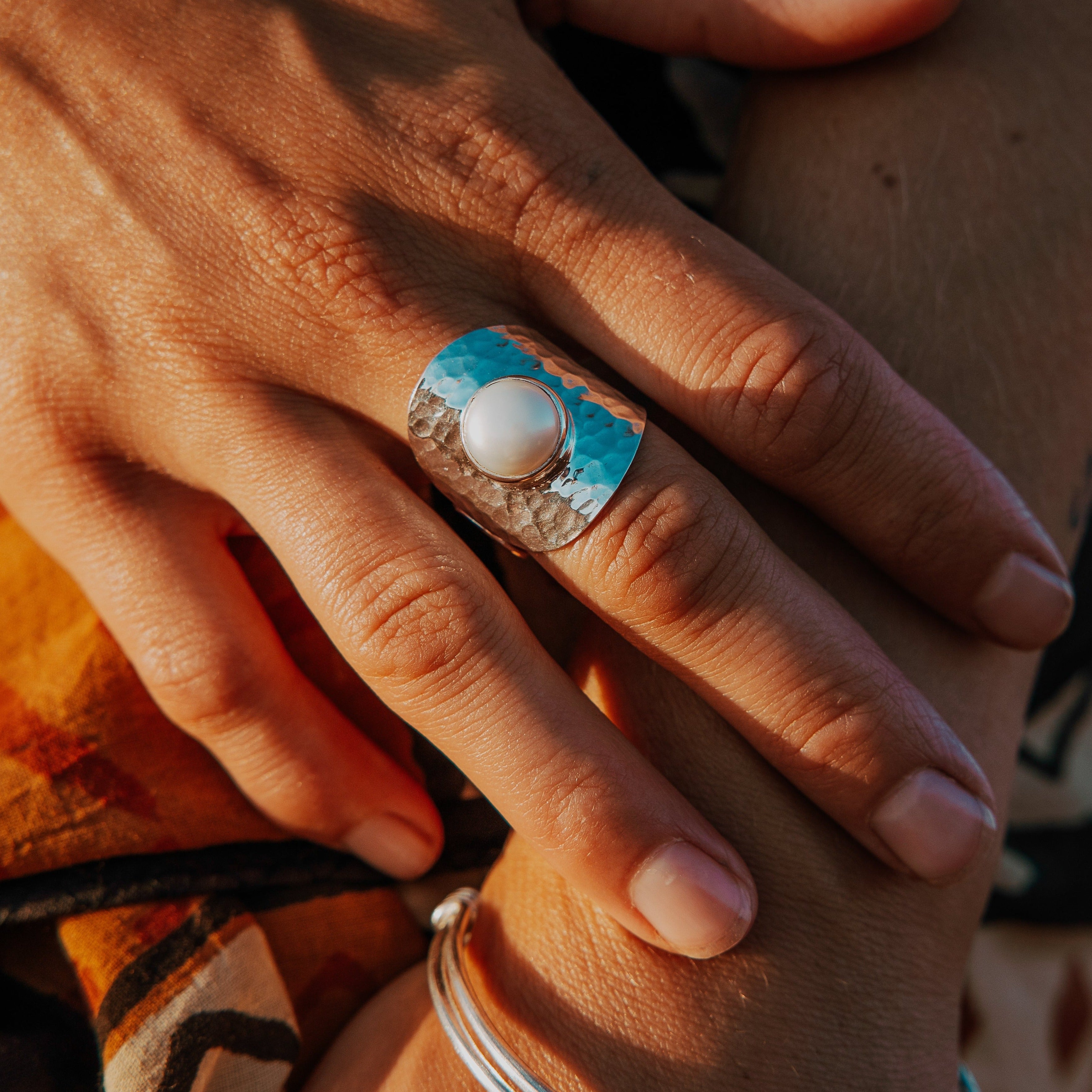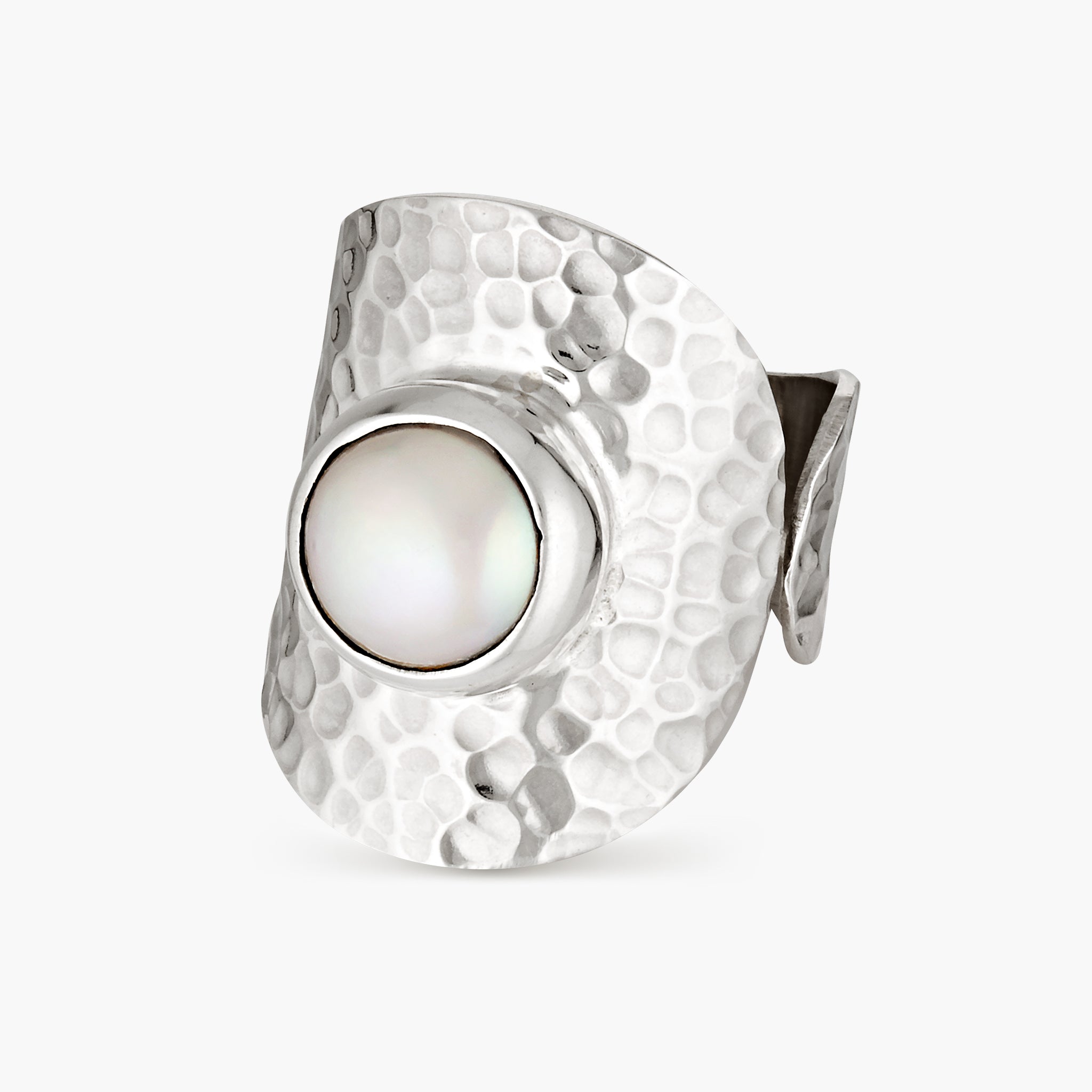 A simple design of Sterling Silver. The hammered finish of our Silver Ripples Ring creates a playful stage for light and shadow to tango. Complimented with a fresh water pearl a semi-precious stone that offers the bearer protection and encouraging truthfulness and wisdom.