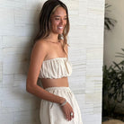 The Cala bandeau is a strapless, multi-fitting top with excess fabric gathered to give a flowing, interesting structure. This is made from 100% cotton muslin with a slightly crushed texture.