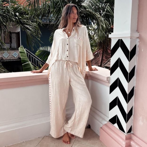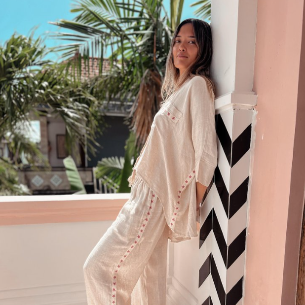 The Supa Stars Version is made from a woven beige linen fabric, featuring a strips of star decals on cotton ribbon.