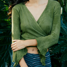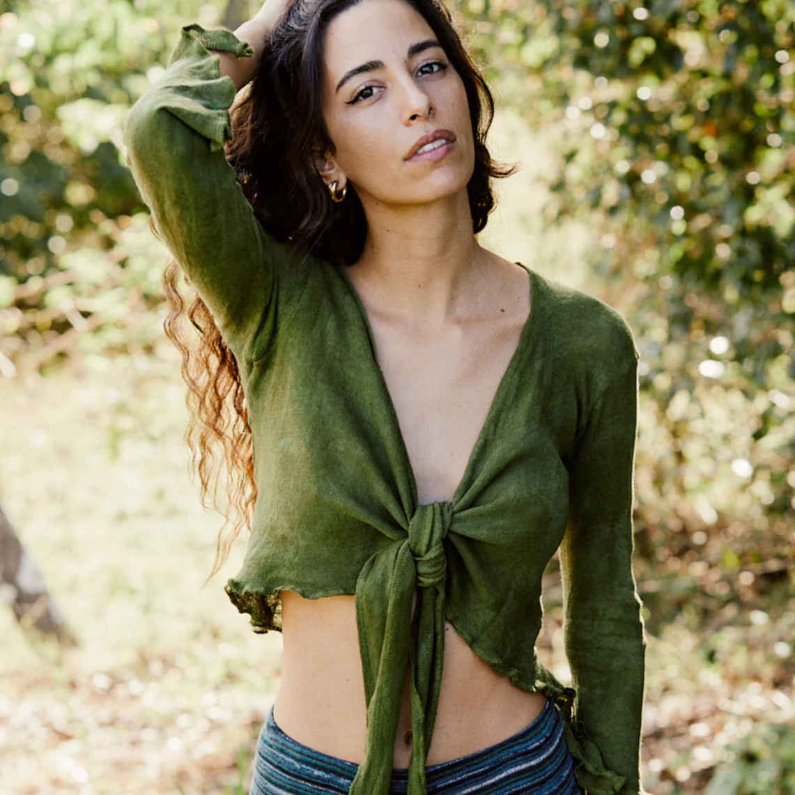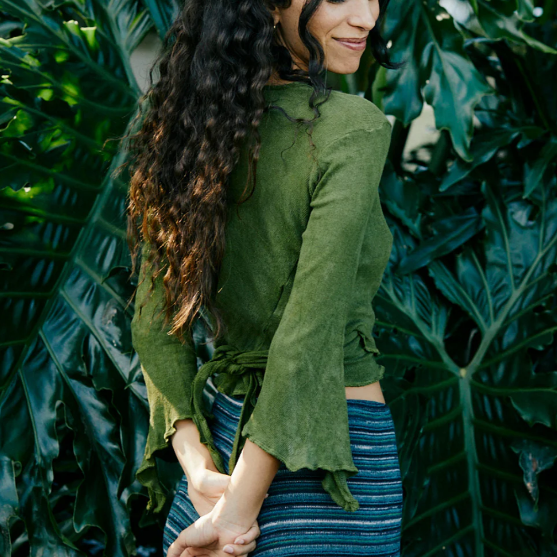 This beauty can be worn tied in the front or wrapped around the waist with a tie in the back. She also looks great in reverse