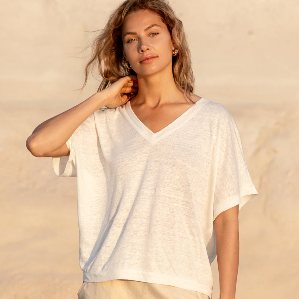 Soft, breathable, and effortlessly polished, the Iris Linen Jersey T-Shirt brings the ease of Mediterranean dressing to everyday wear. Designed in our first-ever premium linen jersey, it features a flattering V-neck, batwing sleeves, and mid-hip length for coverage without bulk. The textured slub fabric adds natural dimension and provides a graceful drape that looks polished and feels comfortable all day.