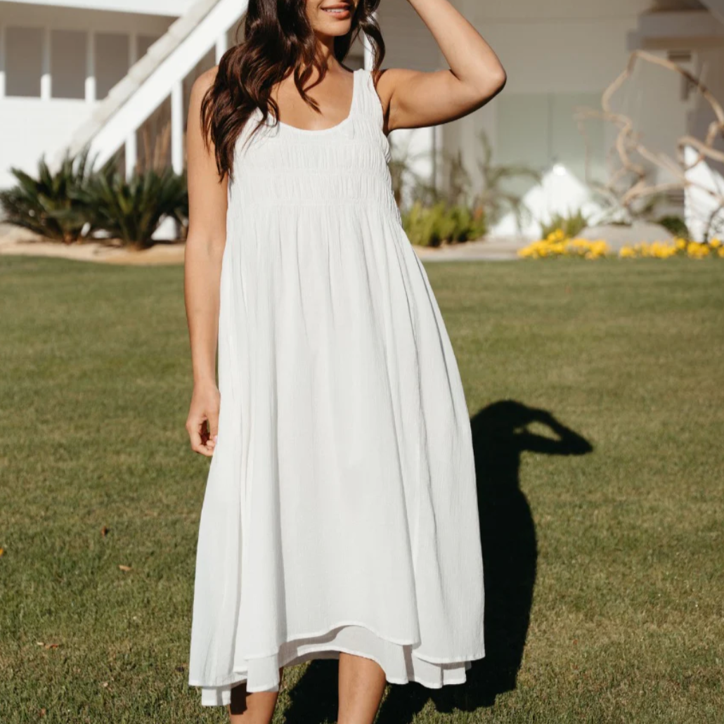 Breezy yet beautifully considered, the A-line Del Monte Midi Dress is crafted in softly crinkled, double-layered cotton gauze with a smocked bodice that gently holds and flatters without clinging. Its floaty, tiered silhouette makes it an easy, ready-to-go dress for your next travel destination.