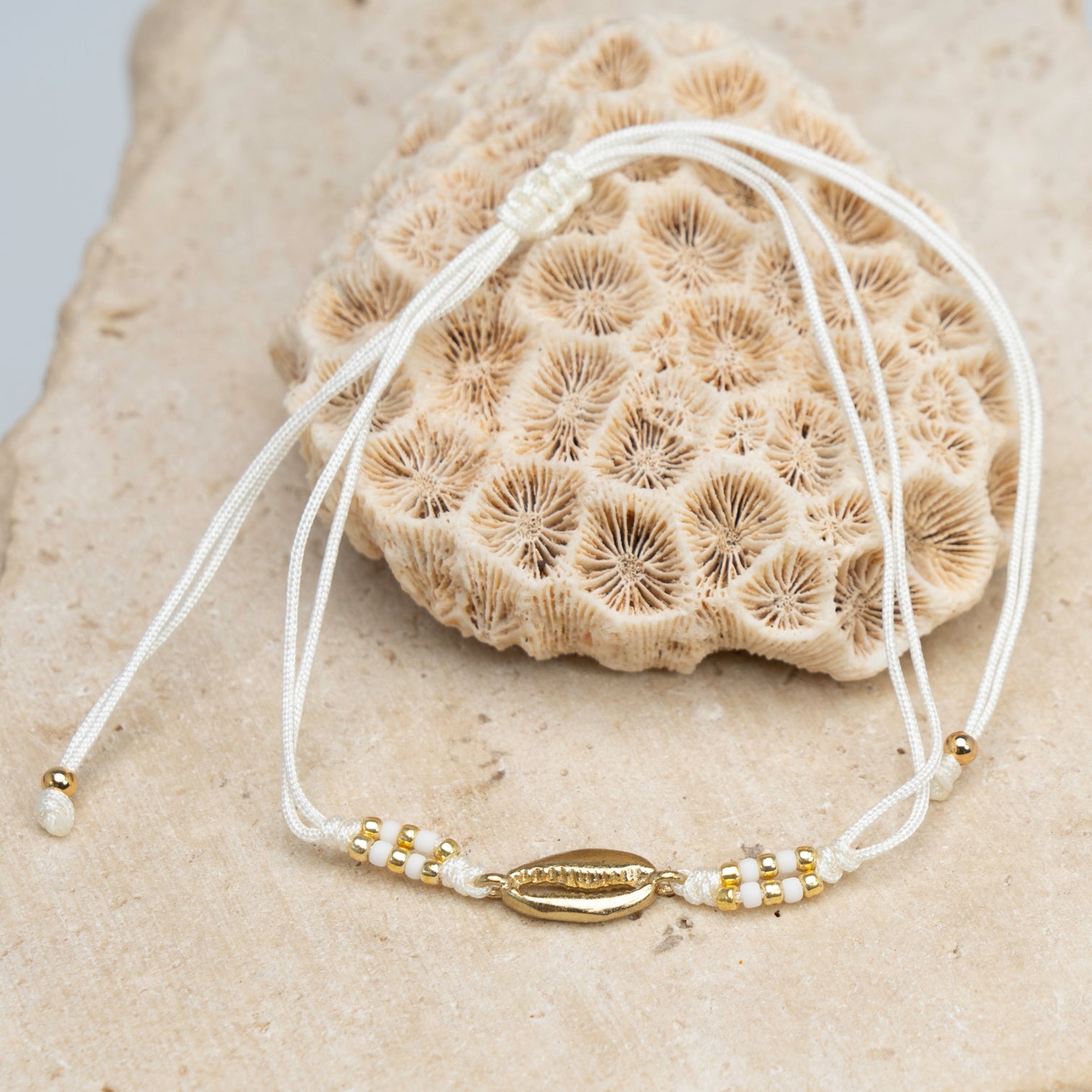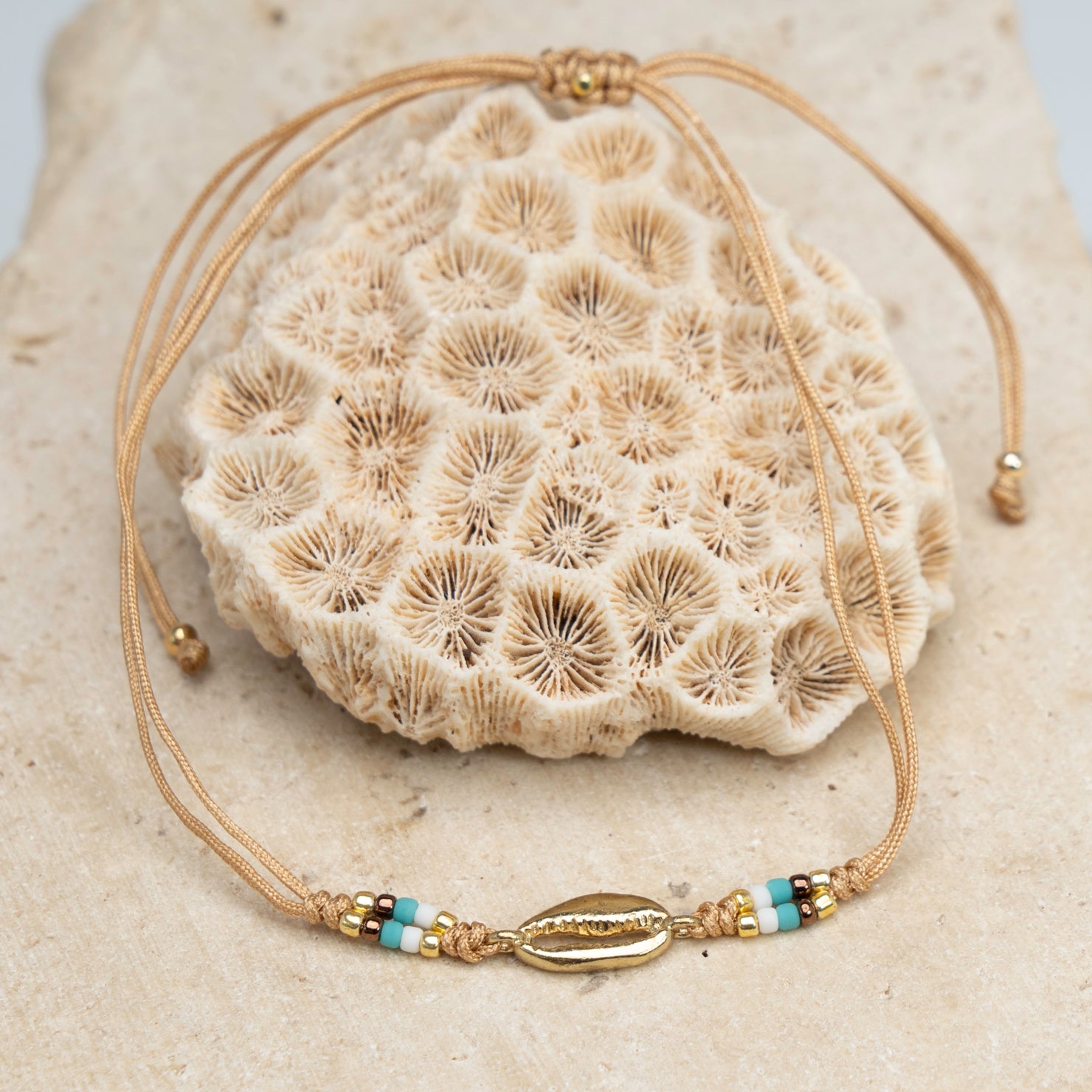 Embrace tropical vibes with the playful Cowrie Island Bracelet, designed for our island-loving dreamers. Featuring a gleaming gold-plated cowrie shell as its centrepiece, this adjustable bracelet is a celebration of carefree, sun-soaked days. The beaded sides add a charming touch, available in two dreamy combinations: crisp white with gold beads or earthy beige with ocean-inspired blue accents. Perfect for stacking or wearing solo, this piece brings a touch of coastal charm to your look, effortlessly blending boho elegance with island-inspired style.