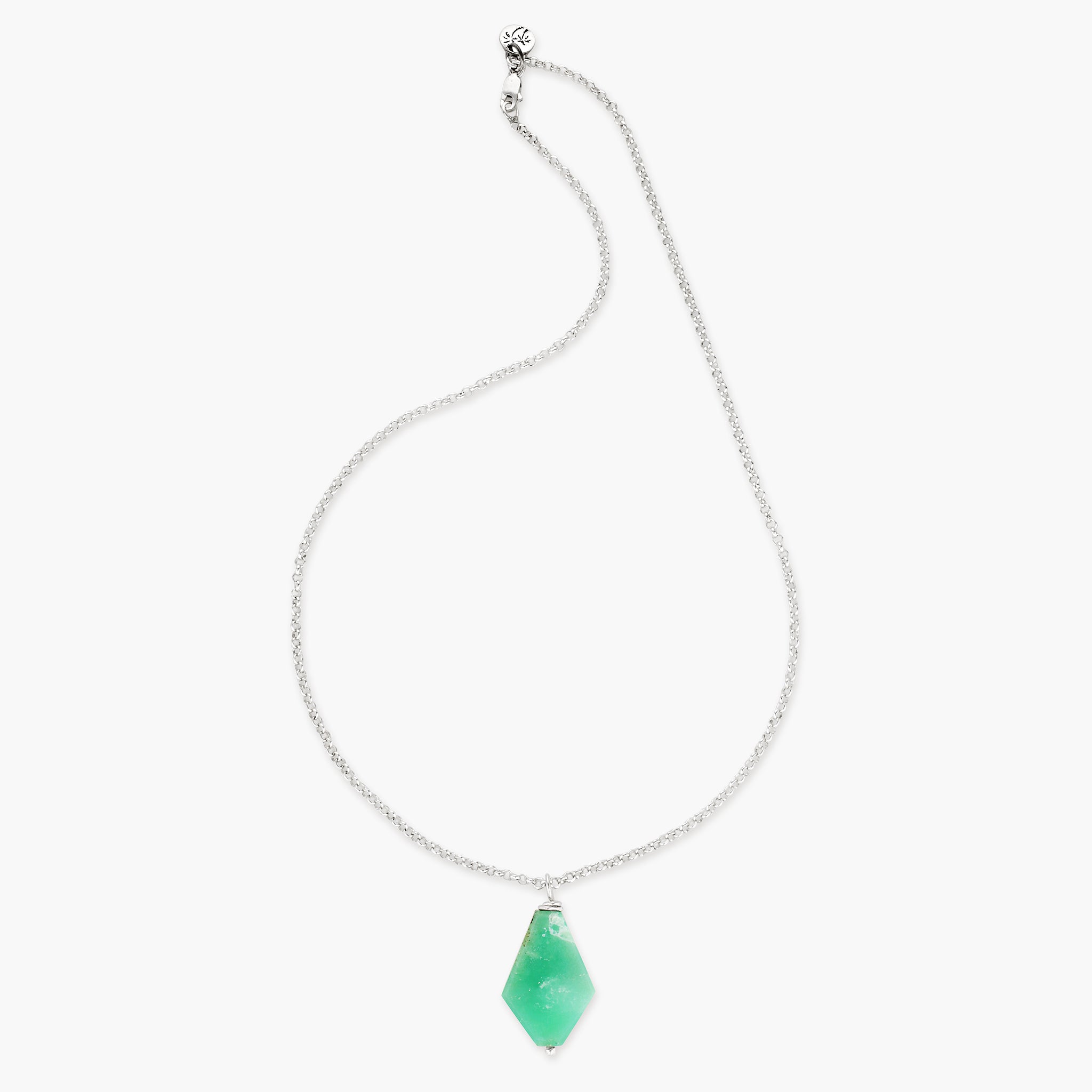Our Forest Ray Necklace is cut in a our signature diamond shape, hardwired onto a Sterling Silver chain to wear and love daily. Chrysoprase is a delightful stone of green rays. Chrysoprase comes in different forms of a mint green or deeper light green shade. Representing abundance and prosperity.
