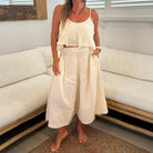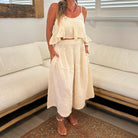 Discover effortless styling with the Maya Top in cream. Crafted from soft and breathable, double cloth cotton with adjustable spaghetti straps and peplum silhouette. This crop top offers a fitted bust with a frill detail. We love this worn with a relaxed fit pant.