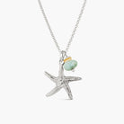 Get ready to make a splash with our Starfish Pendant featuring a stunning Larimar drop. Crafted from sterling silver, this playful pendant is paired with a delicate chain and a cut shell for a touch of seaside charm. Embrace your inner ocean lover with this unique piece!