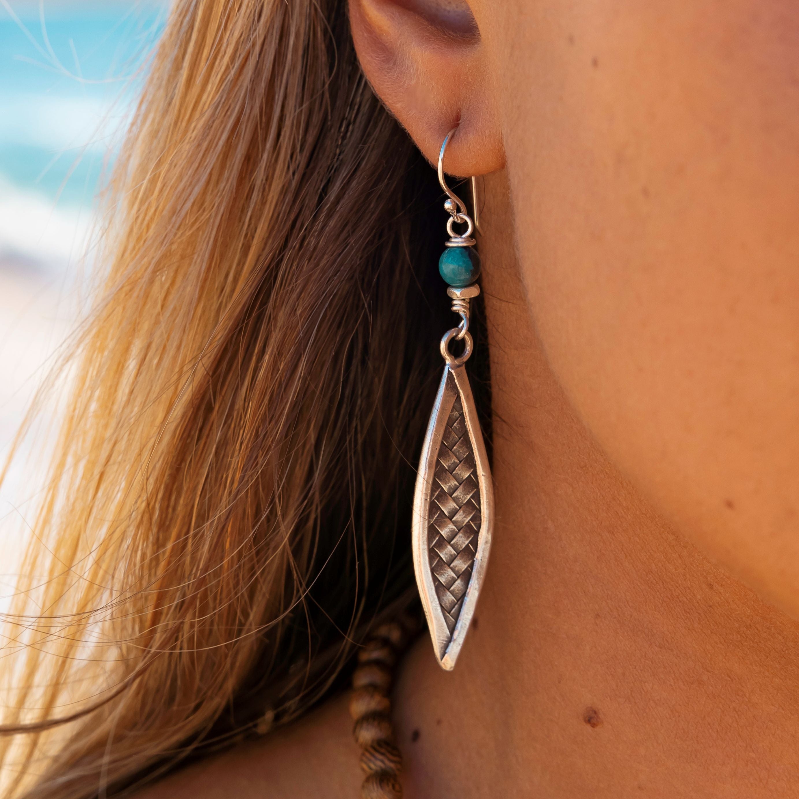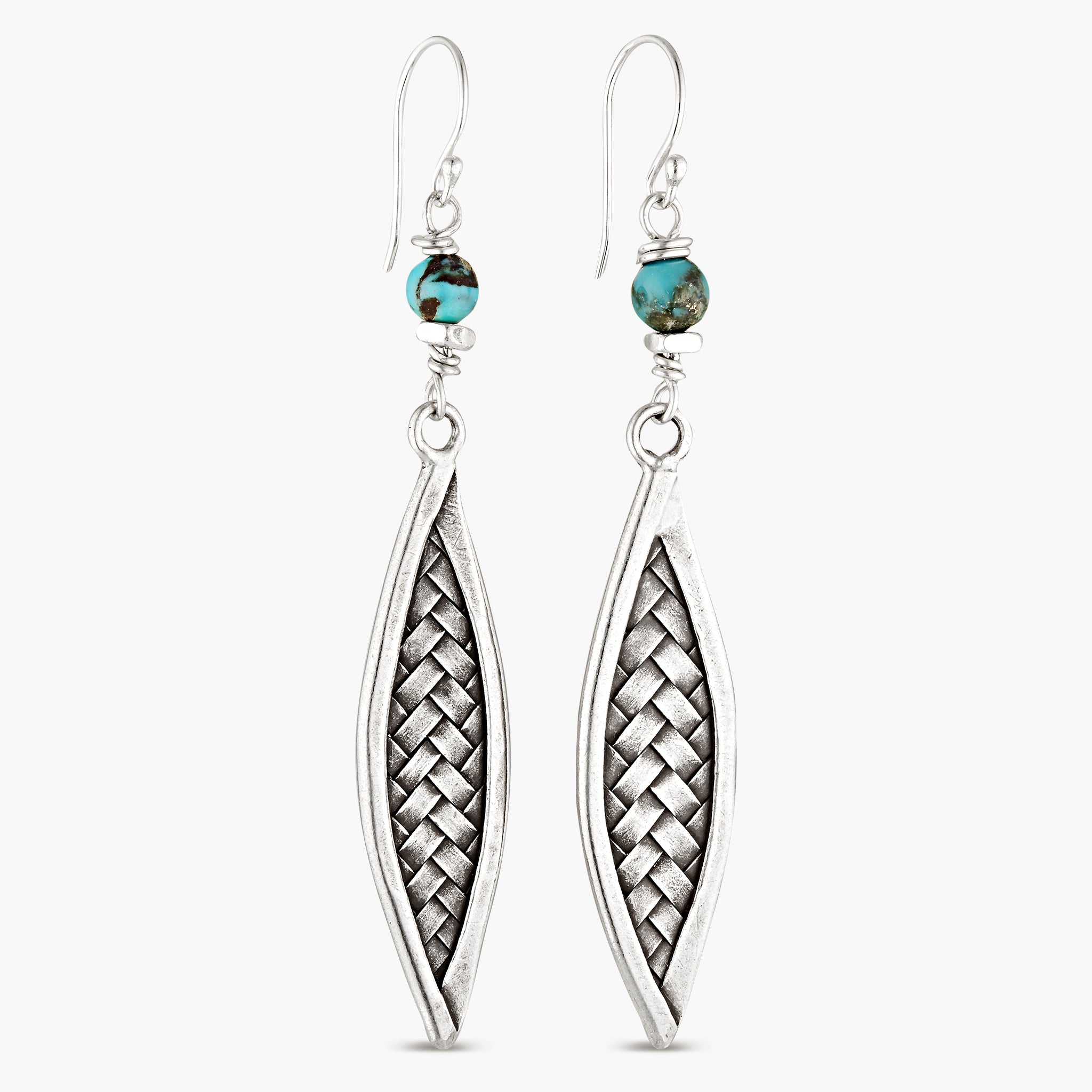 Intricately hand-woven from Hill Tribe silver, the Woven Wonders Drops are a celebration of artisanal craftsmanship and natural beauty. Featuring a tumbled turquoise bead and finished with sterling silver ear hooks, these earrings carry the grounding energy of turquoise and the unique charm of handmade design.